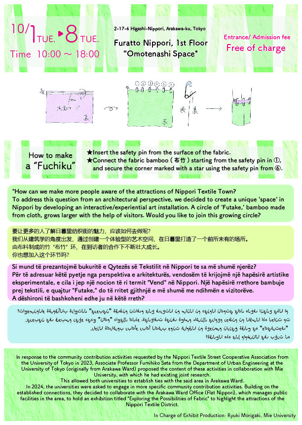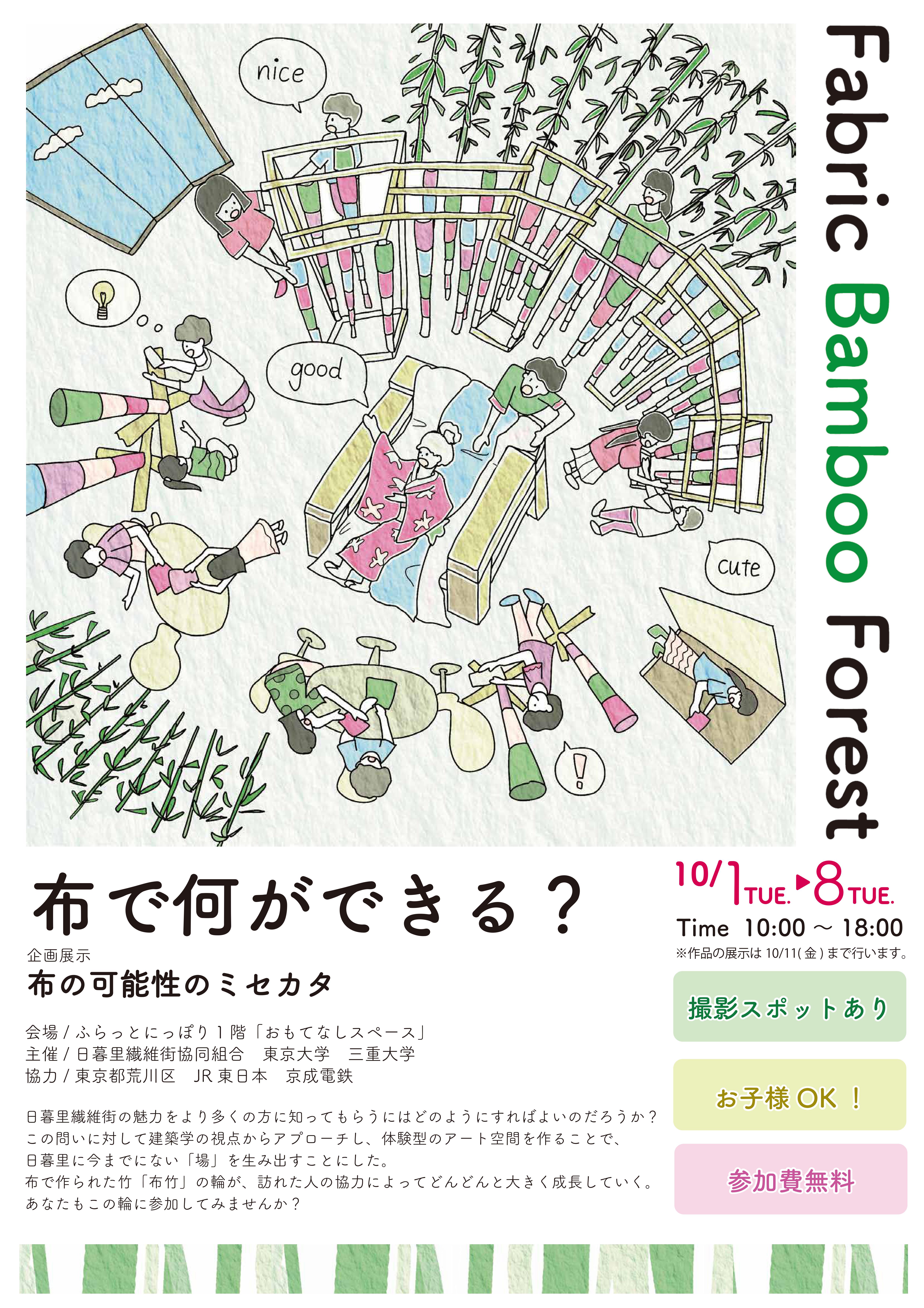 主催 /日暮里繊維街×東京大学・三重大学協力 / 東京都荒川区 JR 東日本 京成電鉄 会場 / ふらっとにっぽり(荒川区)東日本旅客鉄道株式会社日暮里駅京成電鉄株式会社鉄道本部運輸部日暮里駅参加費/ 無料