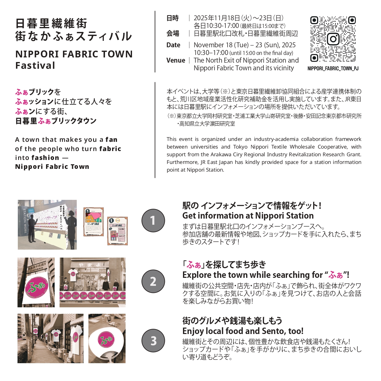 This event is organized under an industry-academia collaboration framework between universities and Tokyo Nippori Textile Wholesale Cooperative, with support from the Arakawa Ciry Regional Industry Revitalization Research Grant. Furthermore, JR East Japan has kindly provided space for a station information point at Nippori Station.