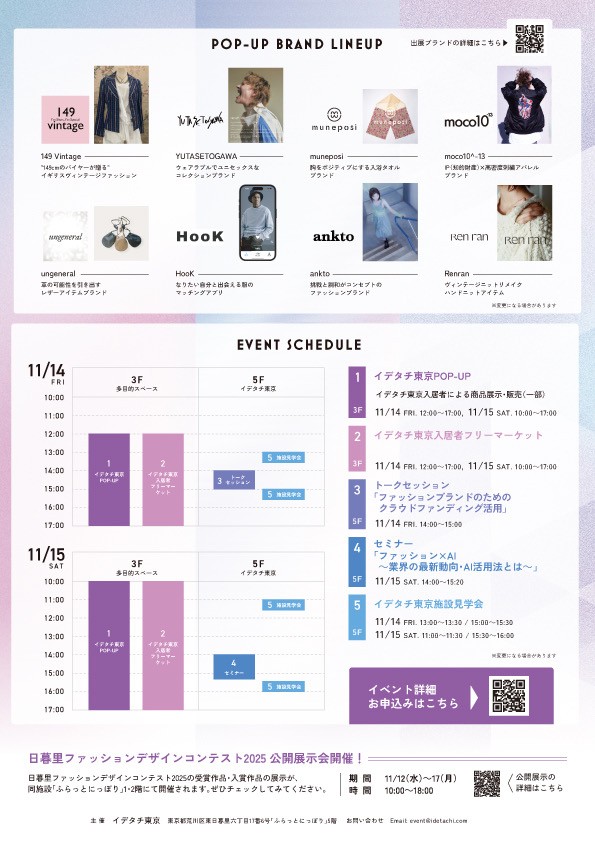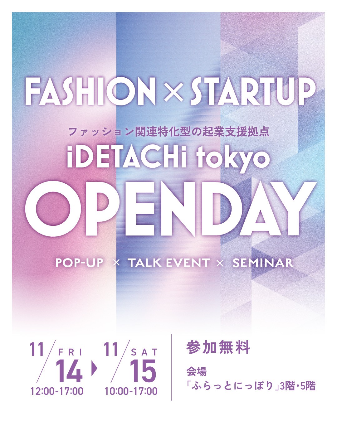 イデタチ東京入居のファッション領域の起業家によるPOP-UP、イデタチ施設内でのトークイベント、セミナー、見学会などを行います。イデタチ東京や、ファッション領域での起業について知ることができる2DAYSイベントです。ファッション関連で起業を考えている方、すでに起業している方、イデタチ東京がどんな施設か気になるという方までぜひお気軽にお越しください。