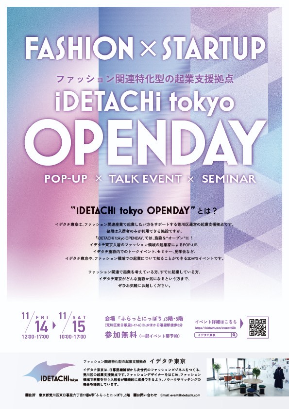 イデタチ東京は、ファッション関連産業で起業したい方をサポートする荒川区運営の起業支援拠点。普段は入居者のみが利用できる施設ですが、「iDETACHi tokyo OPENDAY」では施設を“オープン”に!