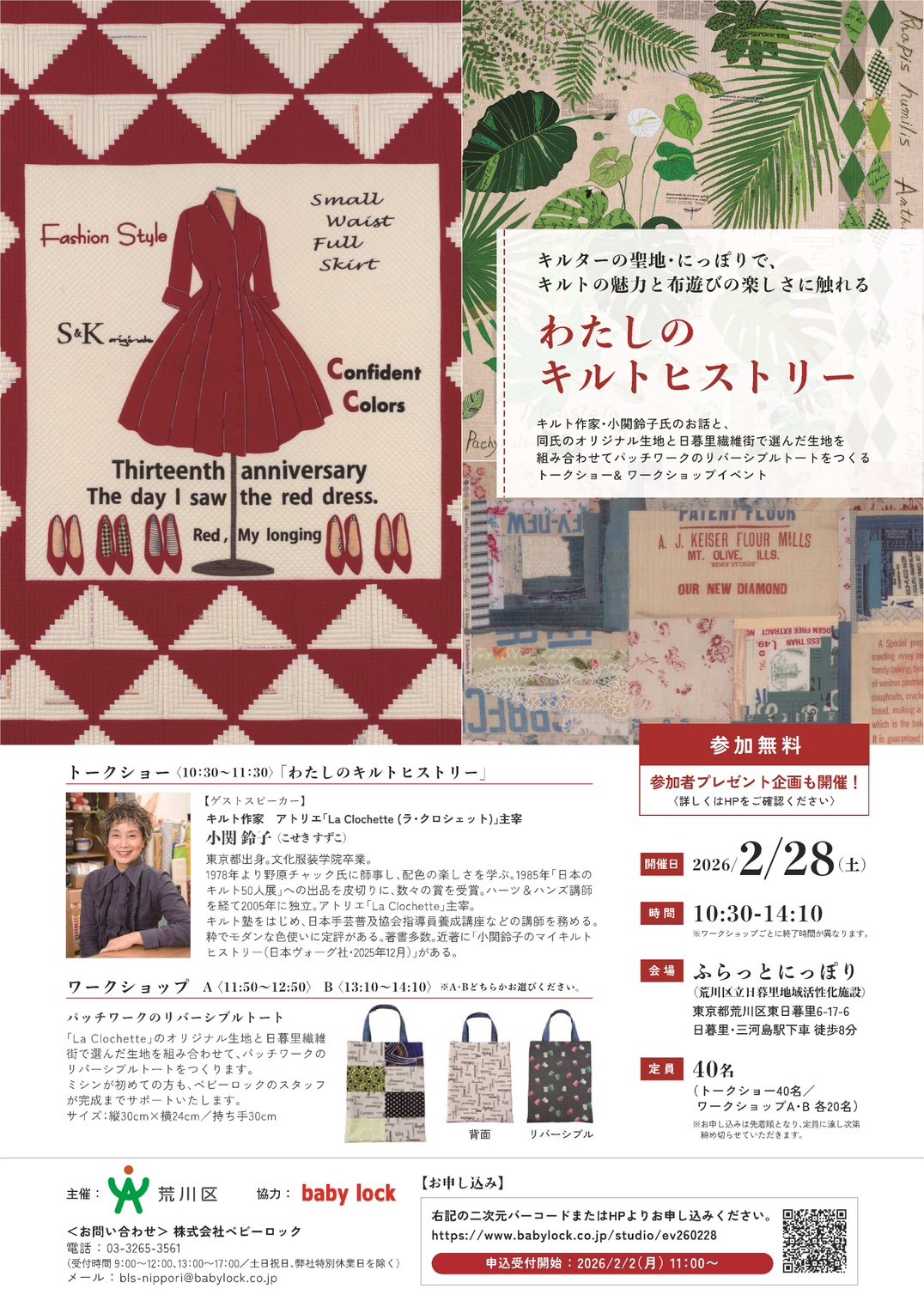 「わたしのキルトヒストリー」をテーマとしたトークショーと、リバーシブルトートのワークショップを開催します。